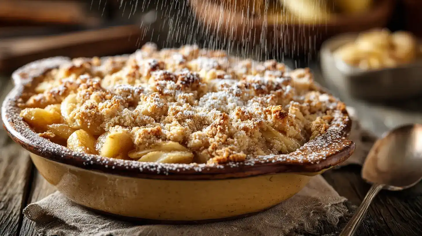 Über den heißen Crumble kommt 1 EL Puderzucker gestreut. Es karamellisiert leicht und fügt dem Dessert eine weitere süße Nuance hinzu.