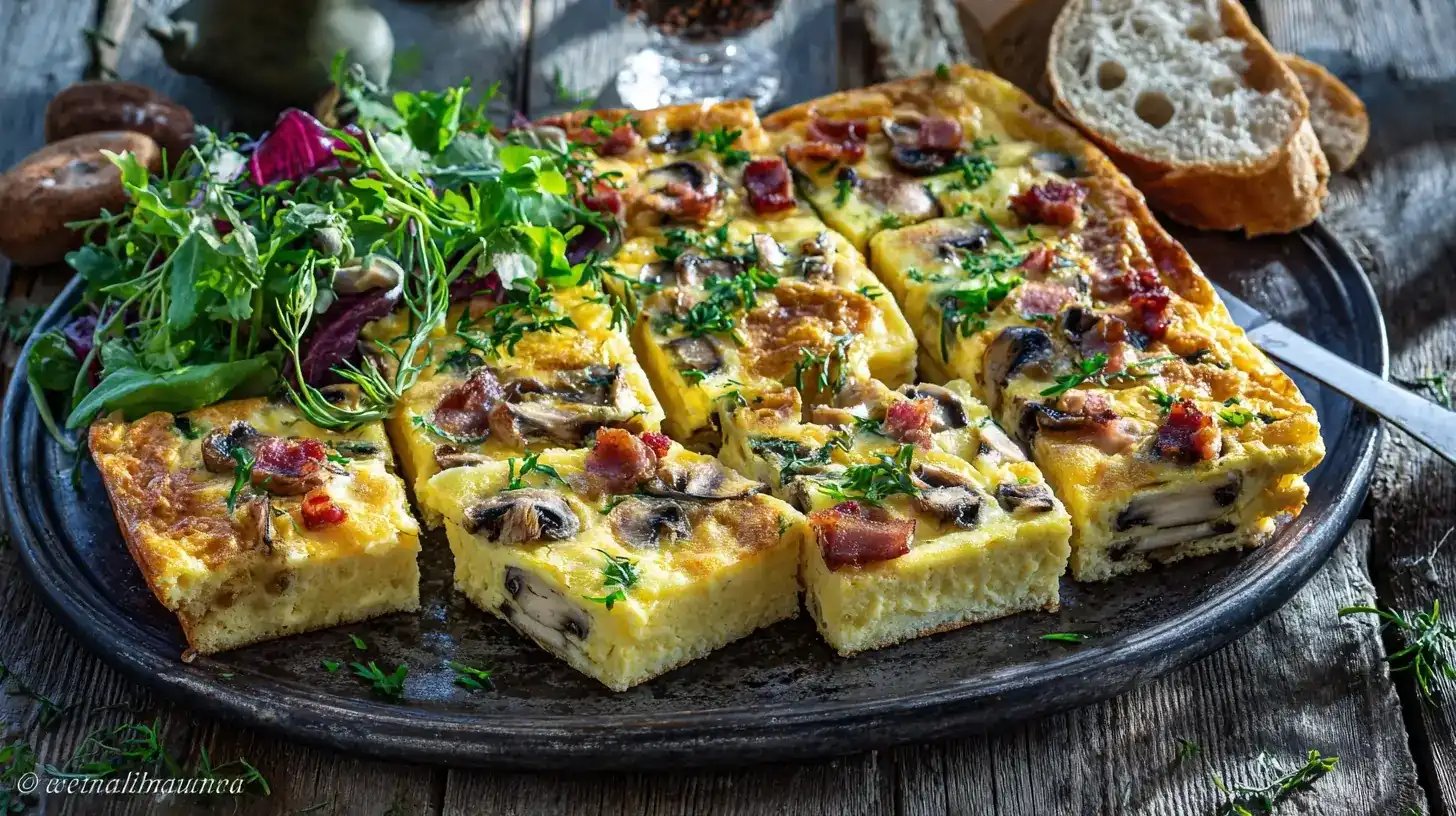 Es ist eigentlich ein klassisches Omelett, nur dass es im Ofen gebacken wird statt in der Pfanne. Eier sind die Hauptzutat, die mit Kräutern, Gewürzen und ein wenig Feigensenf veredelt werden. Gebratene Pilze und würziger Speck (oder eine leichtere Option mit Kochschinken) runden das Ganze ab. Alles wird auf einem Backblech angeordnet und im Ofen gebacken, bis es goldgelb ist. Das Ergebnis ist ein saftiges, fluffiges Gericht, das sich leicht in Stücke schneiden lässt – ideal zum Servieren.